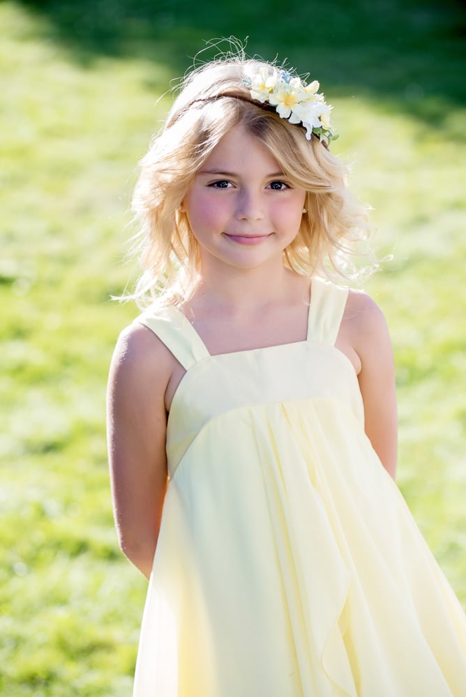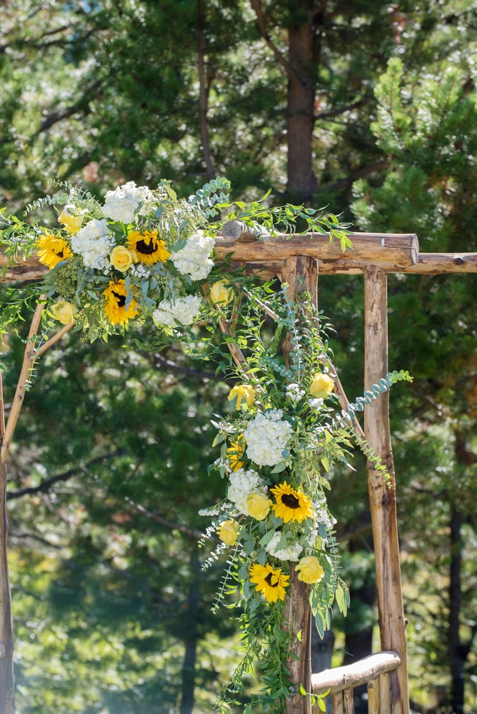 The ceremony was on a grassy lawn outside the lodge, surrounded by forest, and flanked by a beautiful view of the majestic Mount Hood. Three floral installations with white hydrangea, large sunflowers, yellow roses, Italian ruscus and various types of eucalyptus were designed and installed on a simple wooden arbor structure owned by Cooper Spur Mountain Resort. Beside the flower girl crowns, the flower girls also carried baskets decorated with sunflowers and yellow solidaster flowers and filled with yellow rose petals.